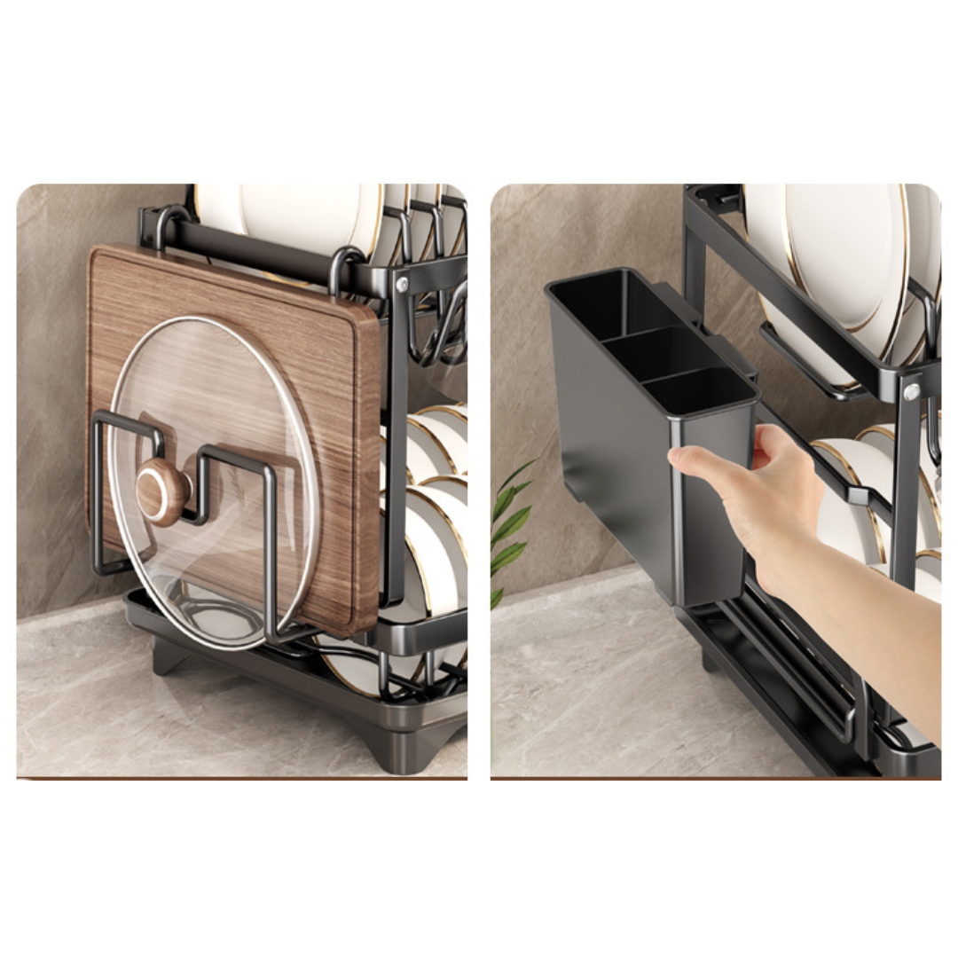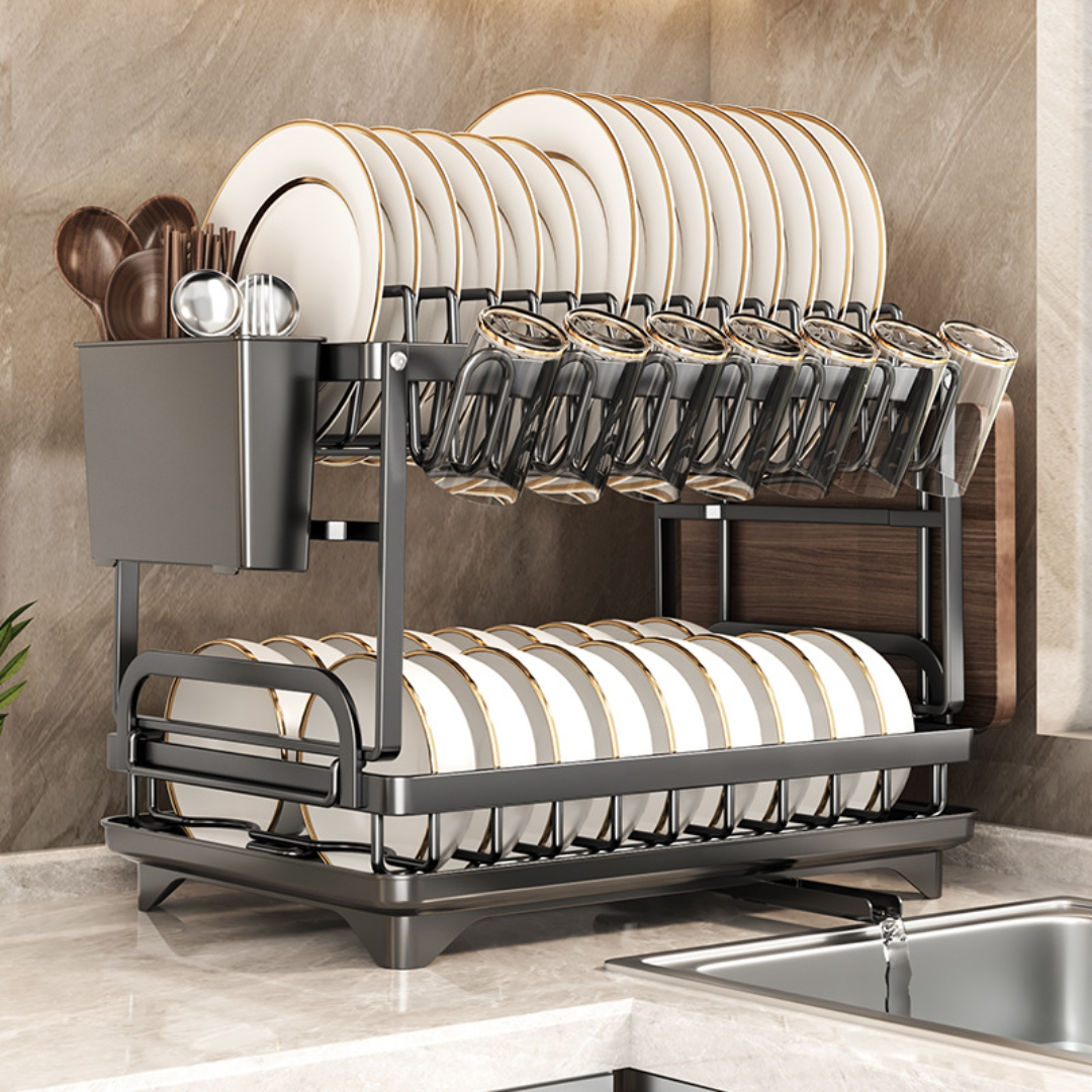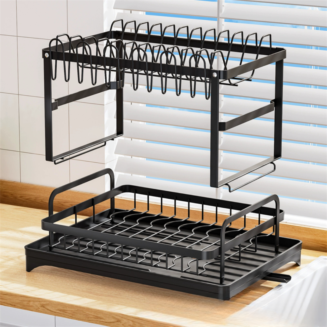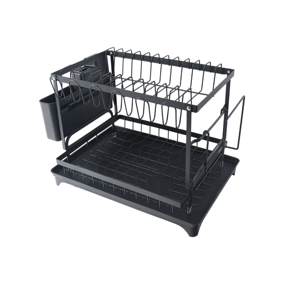 Vneste do svojej kuchyne sofistikovanosť a funkčnosť s týmto elegantný dvojúrovňový odkvapkávač riaduv modernej matnej čiernej farbe. Kombinácia odolný kov s práškovým nástrekoma rafinovaný priemyselný dizajnvďaka čomu je dokonalou kombináciou štýlu a praktickosti.