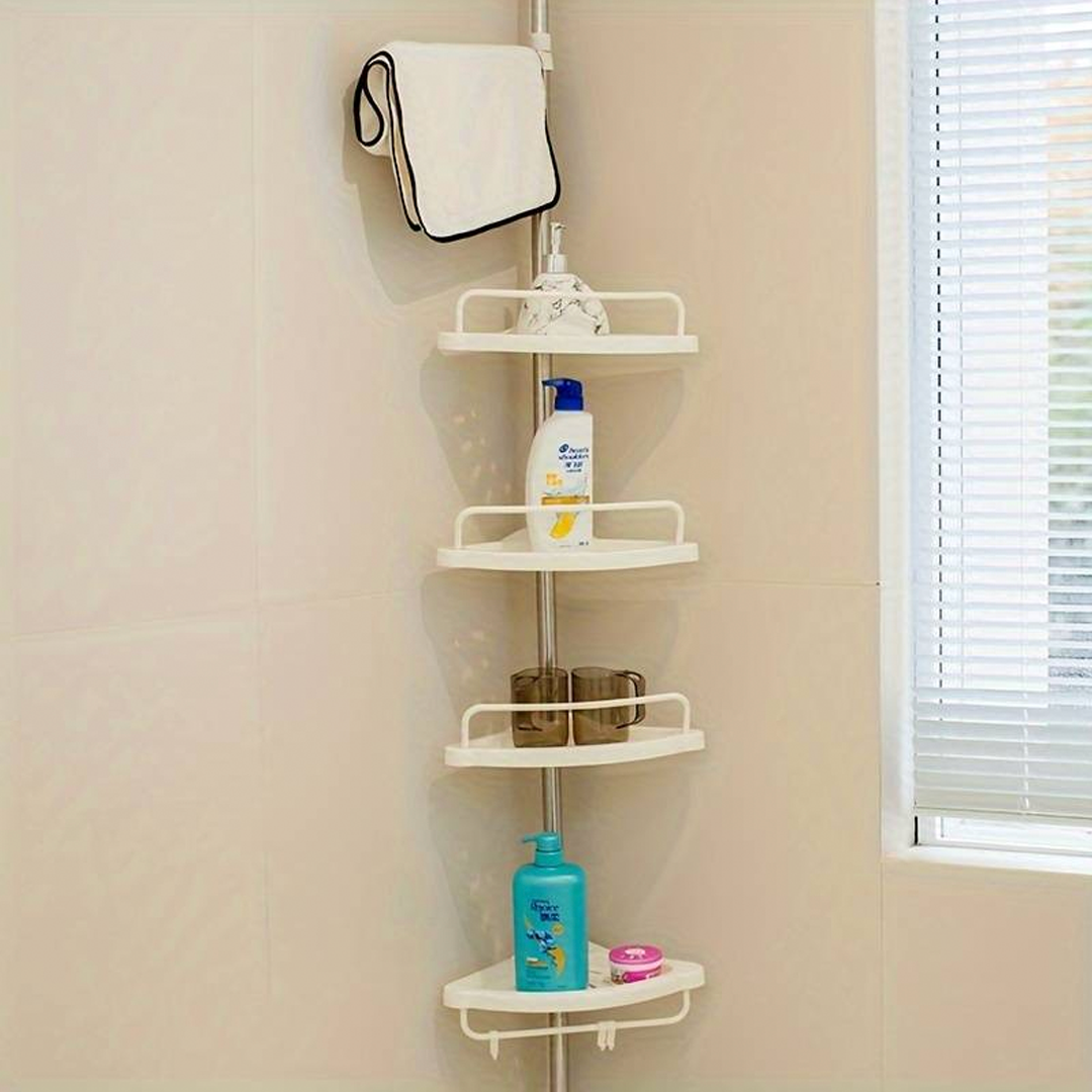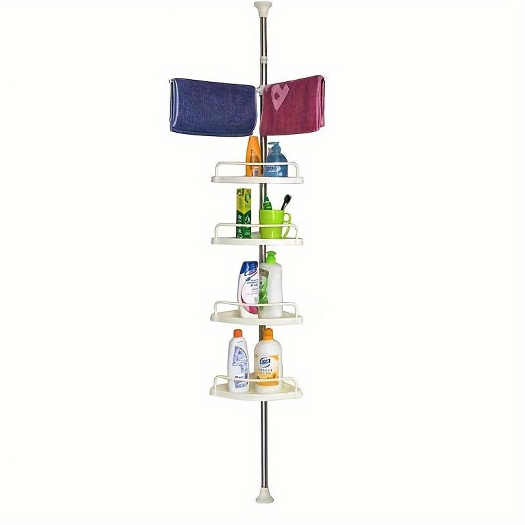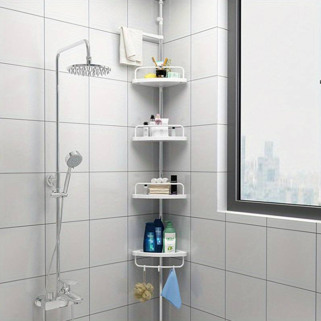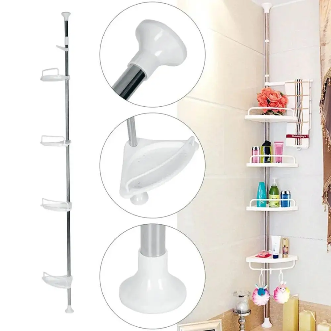 🔧 Teleskopický, pružinový, otočný a uzamykateľný mechanizmus sa v priebehu niekoľkých sekúnd úhľadne zmestí do rohu sprchy (od podlahy po strop) alebo vane (od okraja vane po strop).